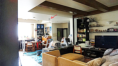 設置箇所は赤い矢印の所。ダウンライトを取り外して付けます。
