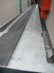 屋上土間の防水下地処理。足場のシートを撤去いたしました。