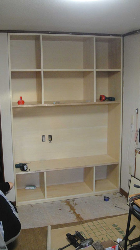 裏張りをした棚を現場に納めたところ。後ほど同じくシナベニアにて扉を施工いたします。