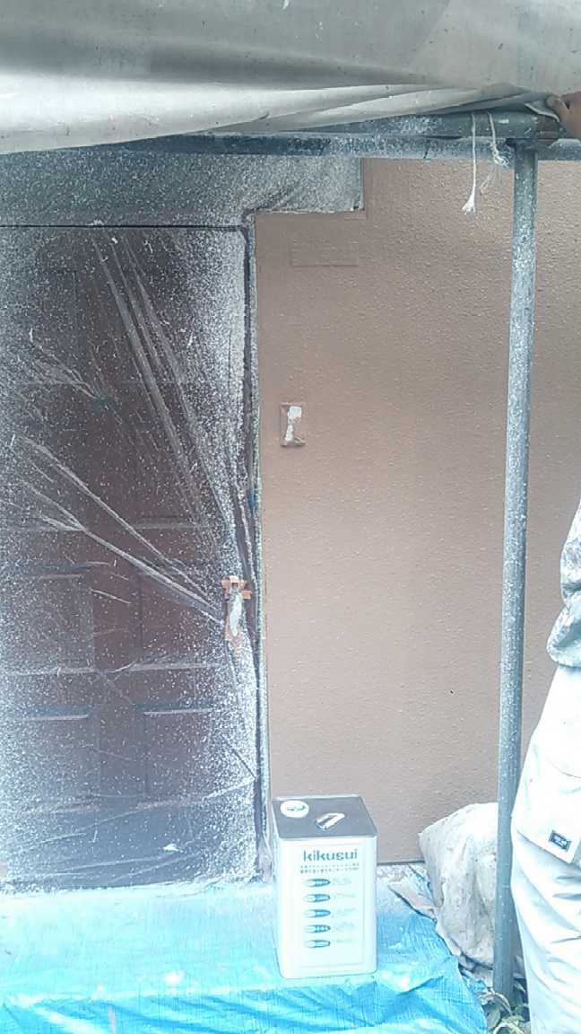 ガン吹き 色づけ 玄関ドア横 の壁 です。