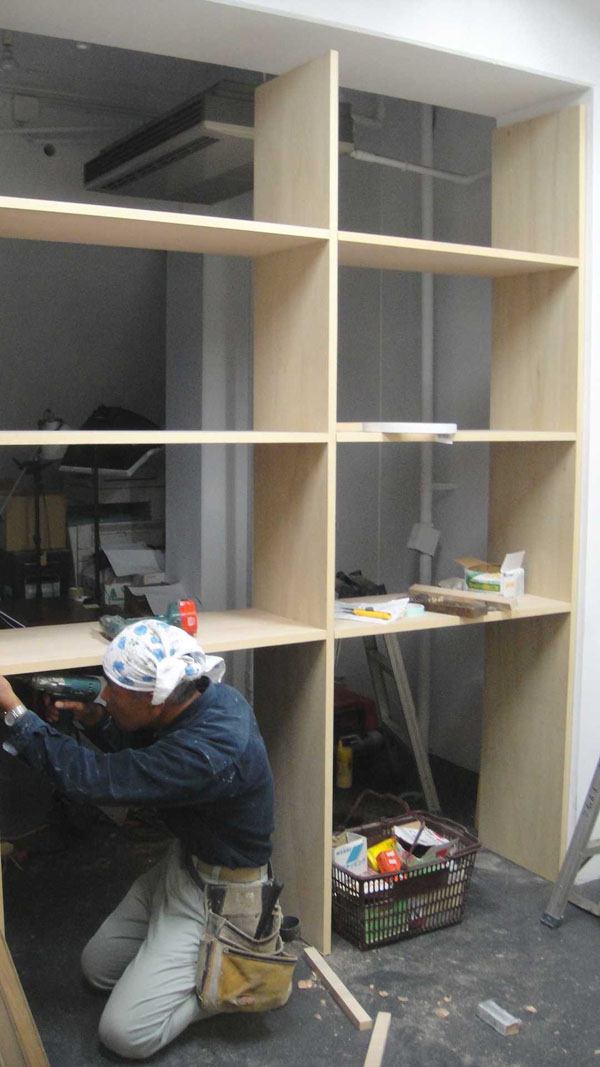 (棚板の裏が ボードを貼って壁になります、、要は、棚が壁を兼用してるということです。)