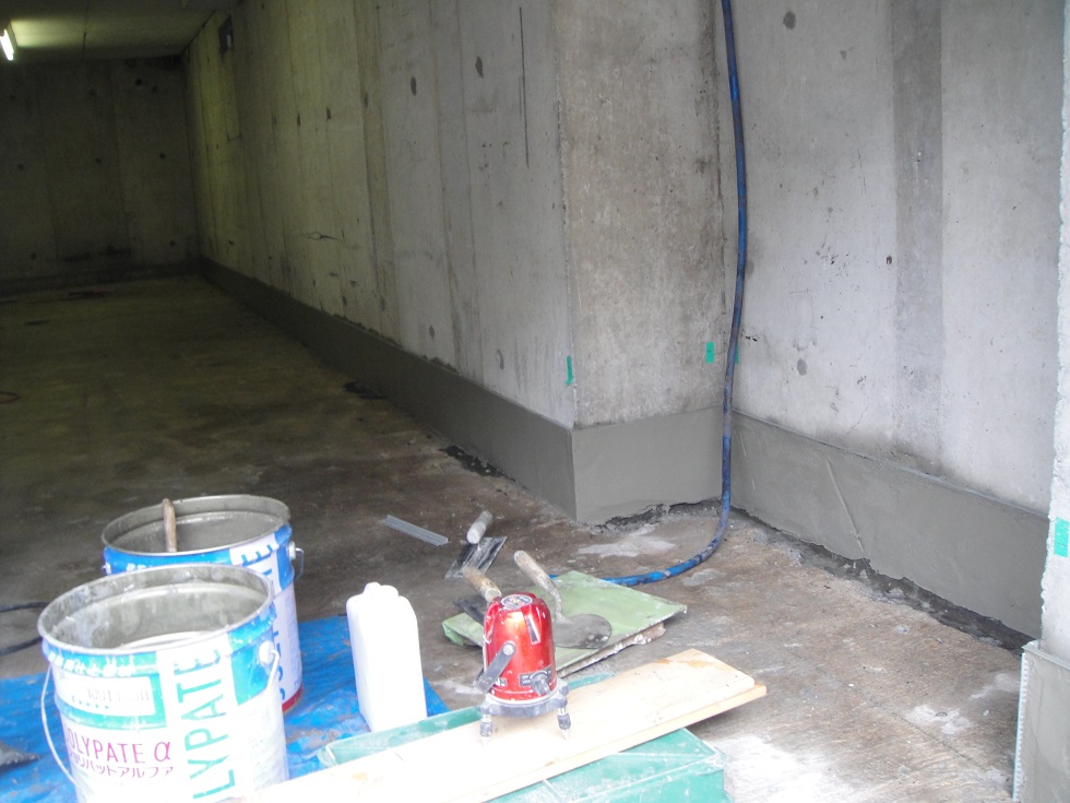 本来 外部土間を 掘削して 壁と土間の取り合いに 防水工事 行うべきですが、、施工上問題があるため、、