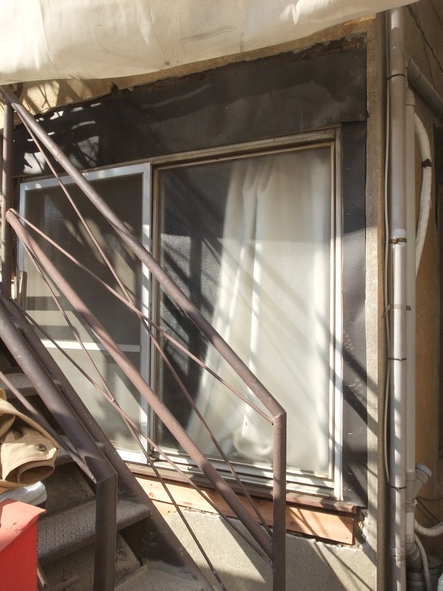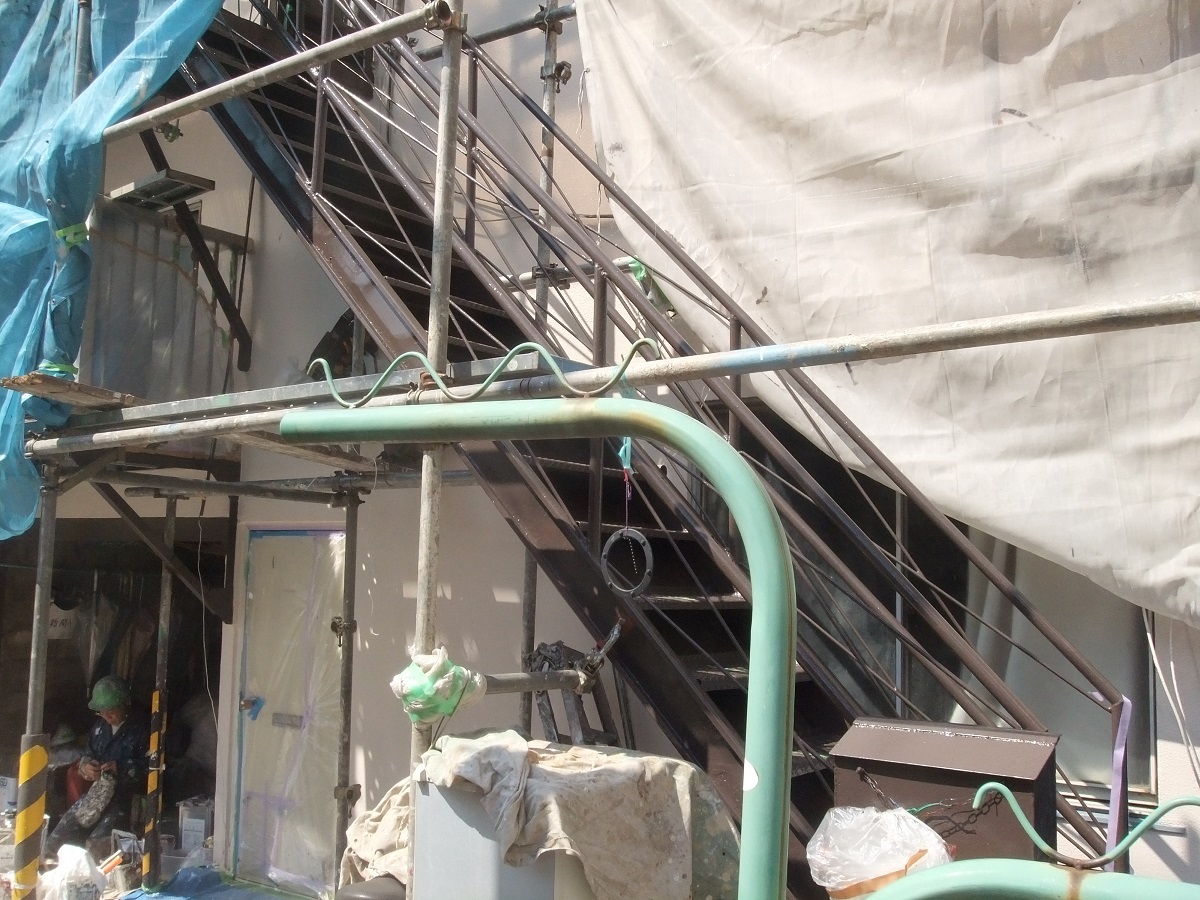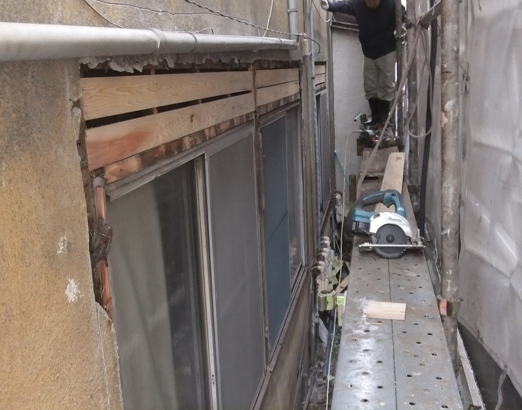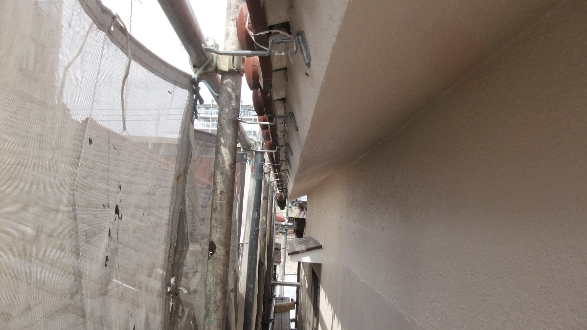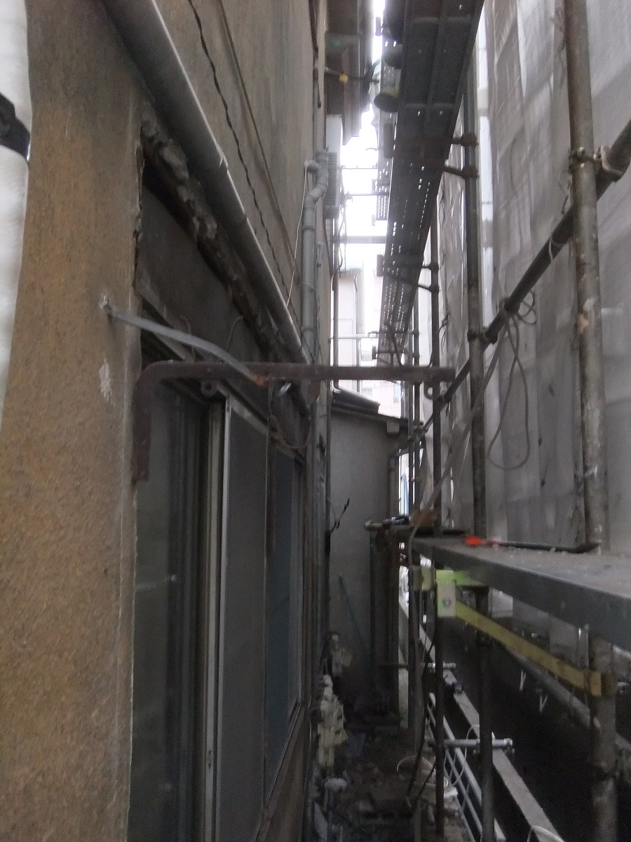 今月末 足場をかけ 既存シャッターBox すべて撤去 外部壁モルタル浮いてる場所 剥がし ラス貼り モルタル 改装強化 手すり交換