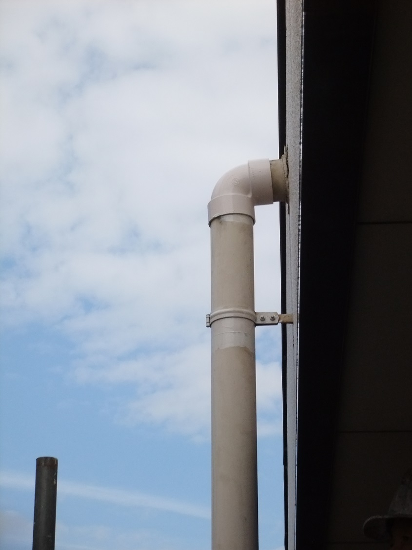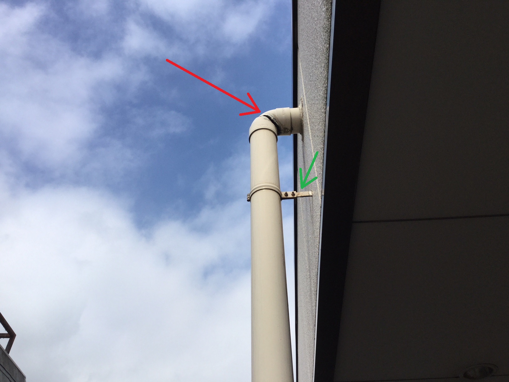 赤い矢印の部分 からの漏水 原因は 配管止めのバンド(グリーン矢印)が 躯体より 外れて 風の為での 破損です。