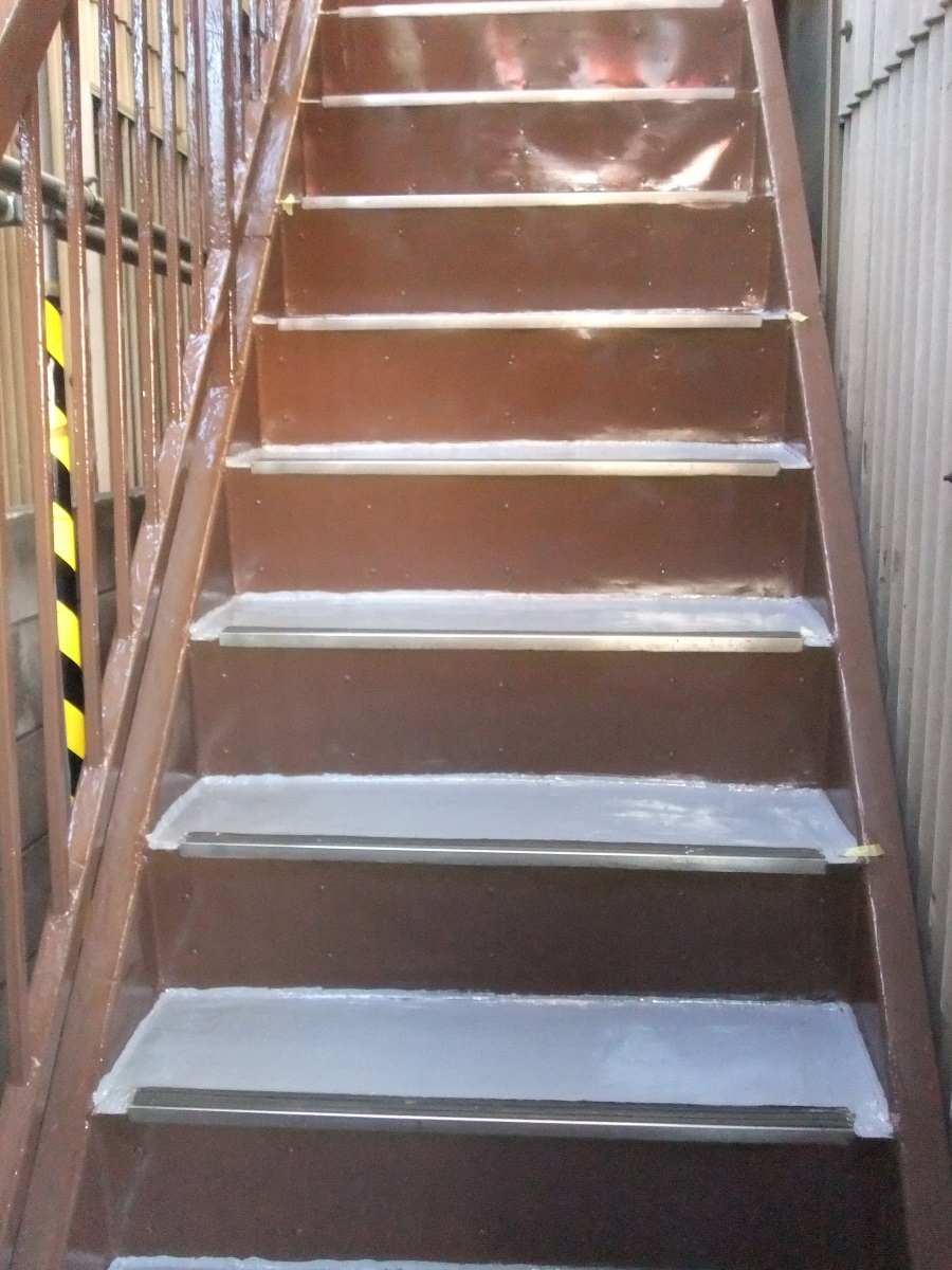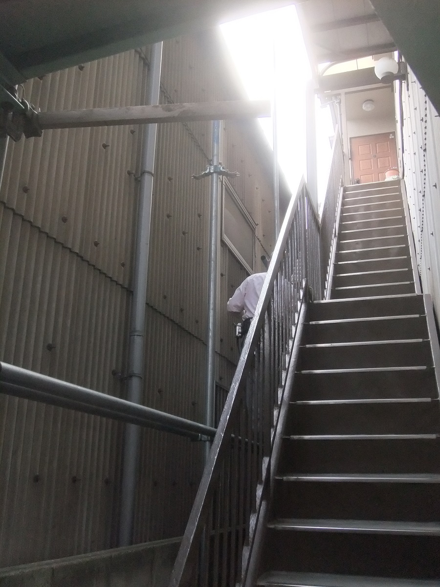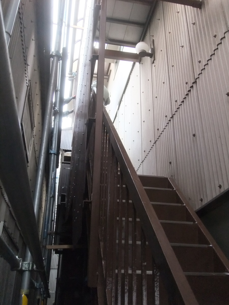 3Fまでの ストレートの階段です。 足場を側面にかけ 手擦り外に 鉄骨で下地を組み 塗装に 壁、屋根を ポリカを貼る工事です。