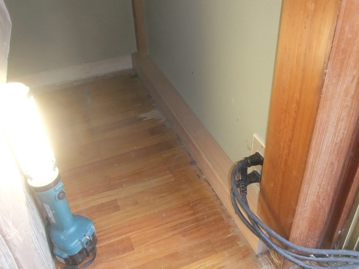 1F グランドピアノの 置いてあった 洋間を和室に 改造した 畳を 一枚上げたところ、、敷居側面が、、被害に