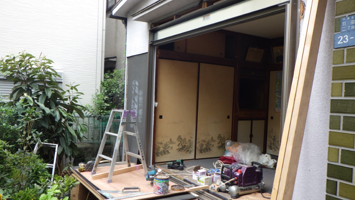 手すりをとり 既存サッシュの 撤去に取り掛かりました。