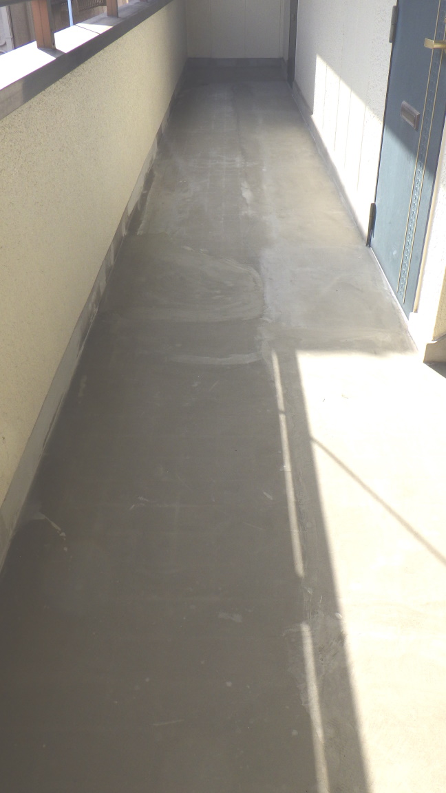 下地 再調整。 継ぎ目のない 長尺シートで 共用廊下を 施工します。