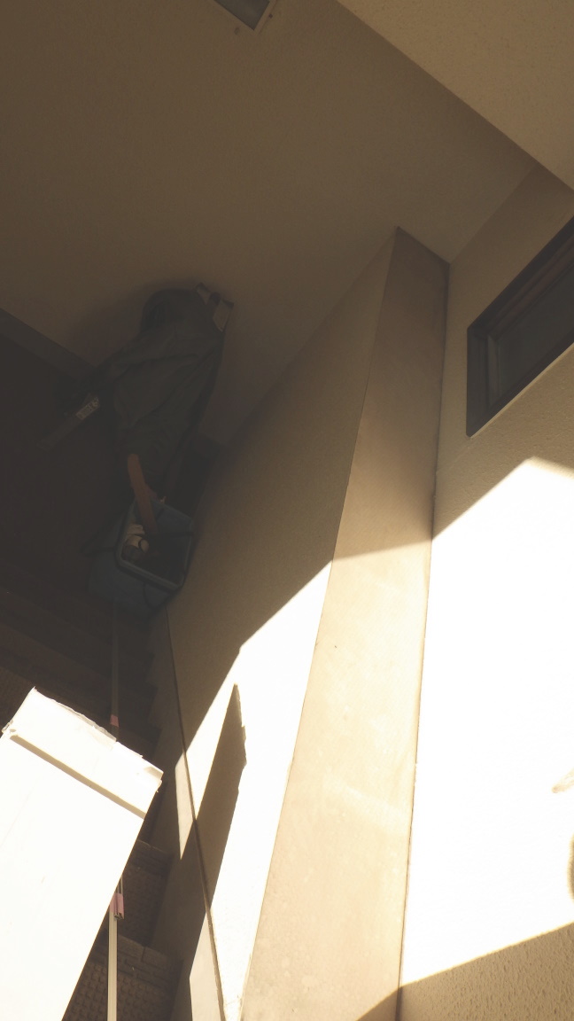 カチオンを タイルに塗ってから 処理準備 共用部分は 通行するため 半分ずつ下地処理を 行います。