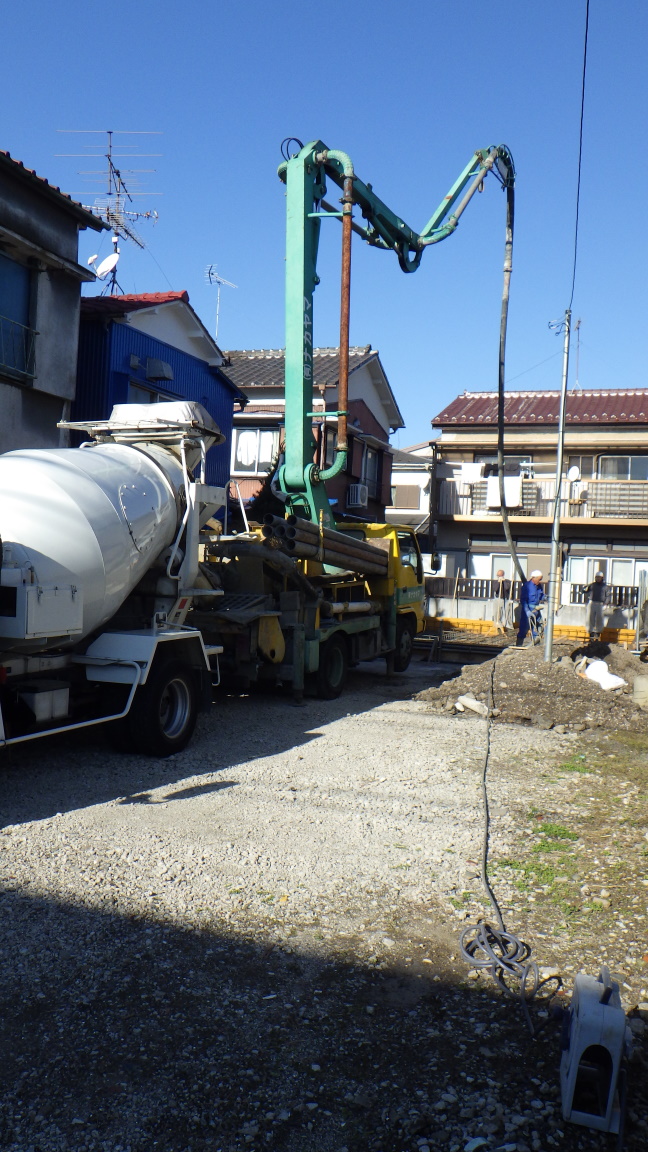 ミキサー車に ポンプ車 いよいよ 耐圧打設工事です。 今日は暖かく 良かったです。