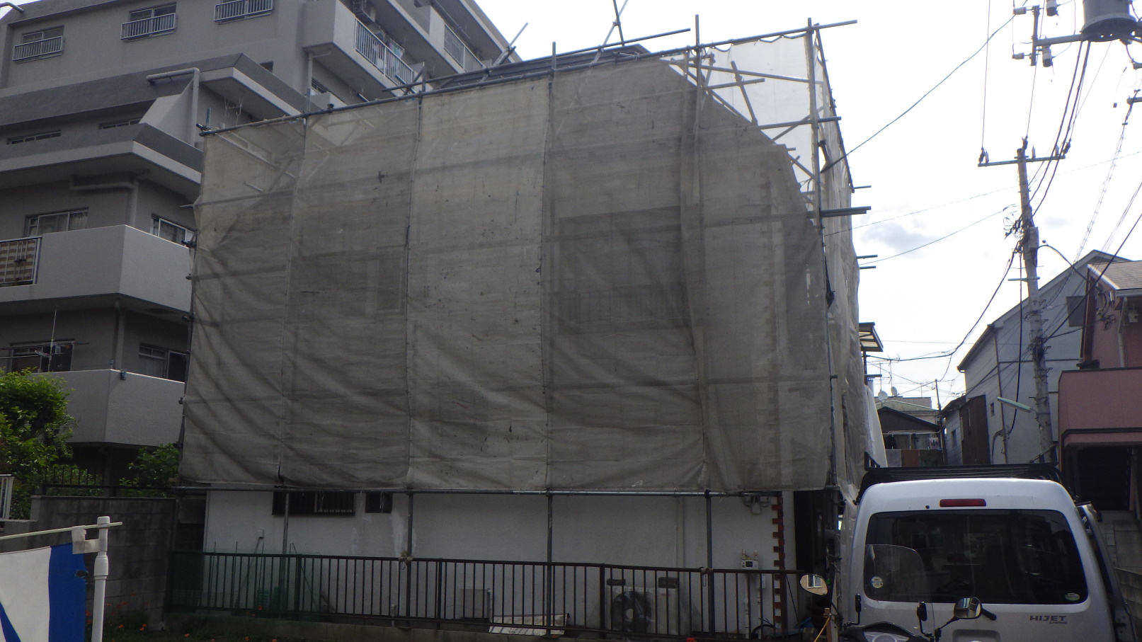 足場 養生 完了。 高圧洗浄に とりかかります。
