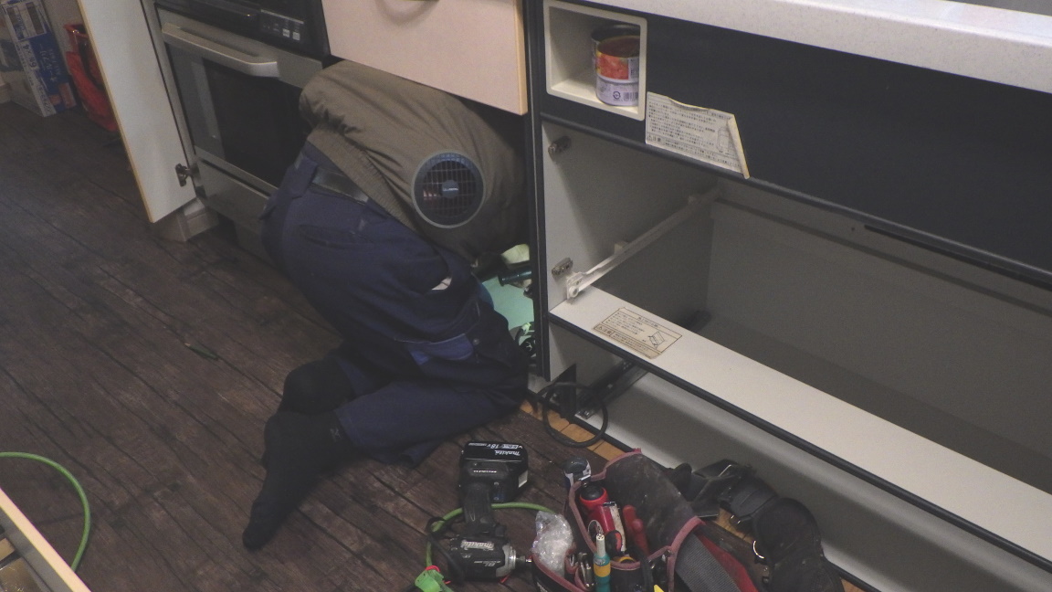 洗濯機移動 の為 配管工事に取り掛かります。 システムキッチンの後ろの配管スペースを利用し全く別の場所に 移動します。