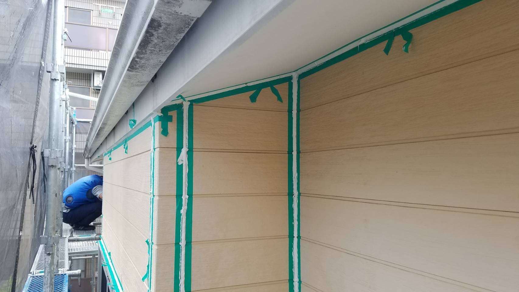 古いシールを撤去して マスキング後 New シール打ち込みです。 今週いっぱいシール工事 来週より 塗装工事に 取り掛かる予定です。
