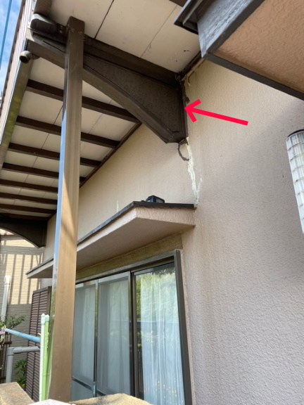 勾配が建物のほうに 水が流れ また 腕木(赤い矢印)うら クラックよりの 水の侵入でした。