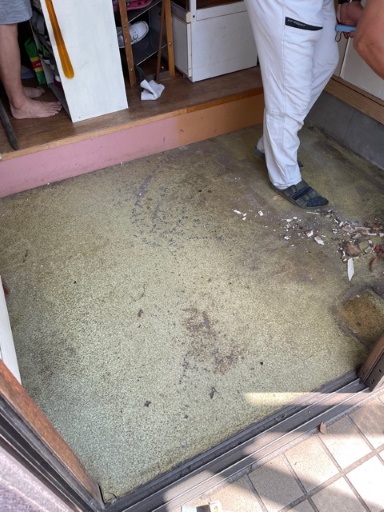 追加工事で 玄関土間を 重歩行用 CF に 貼り換えます、 施工前
