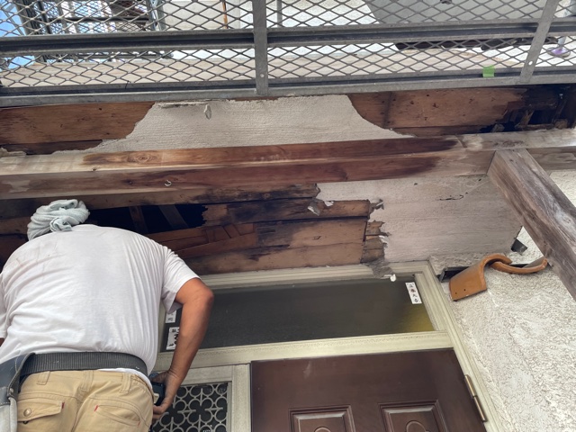 軒天 を 下地を修理しながら 仕上げます。 雨トヨも 仮付け します。