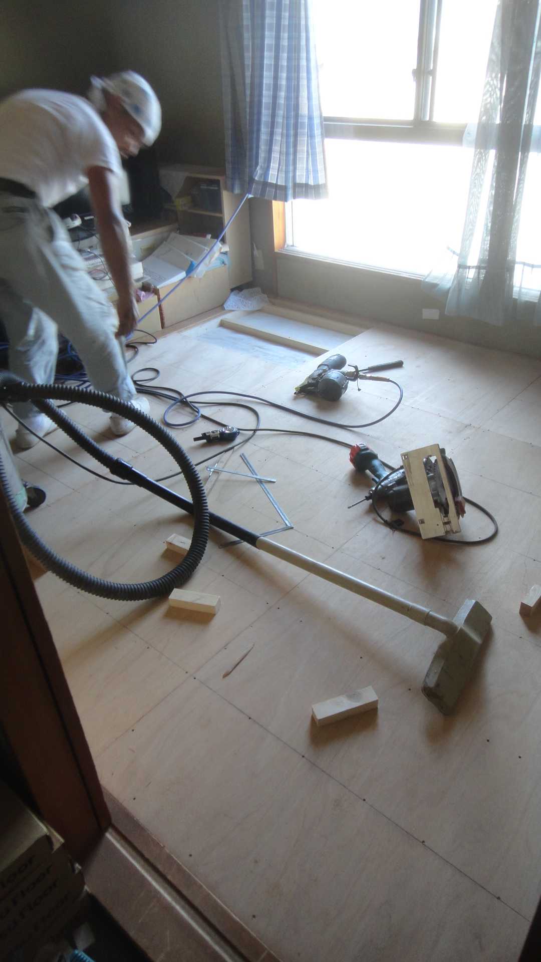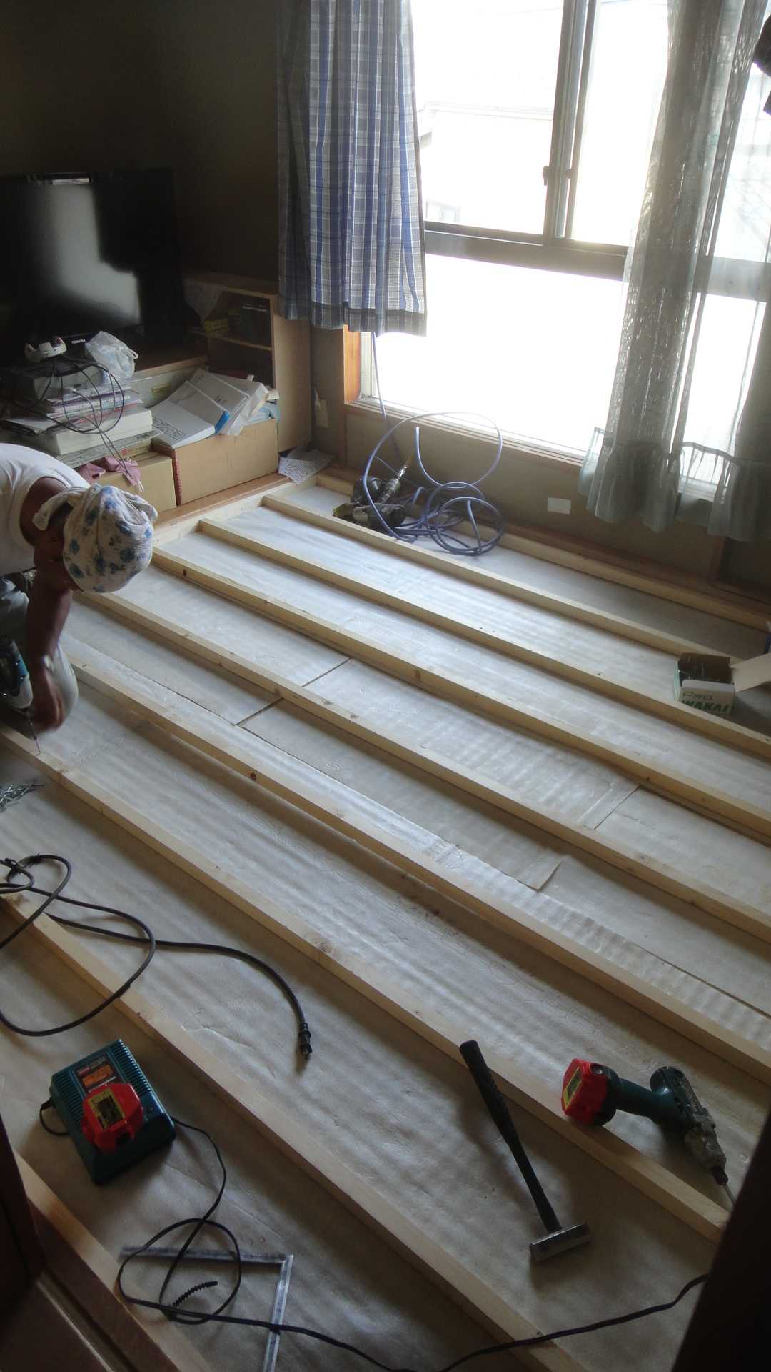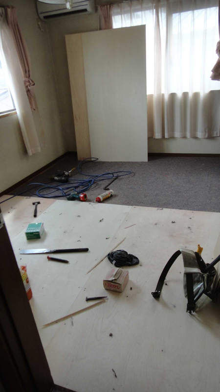 畳の撤去した後、床根太を設置してその上にべニアを貼り、フローリング下地、コンパネ15mmを貼りました。