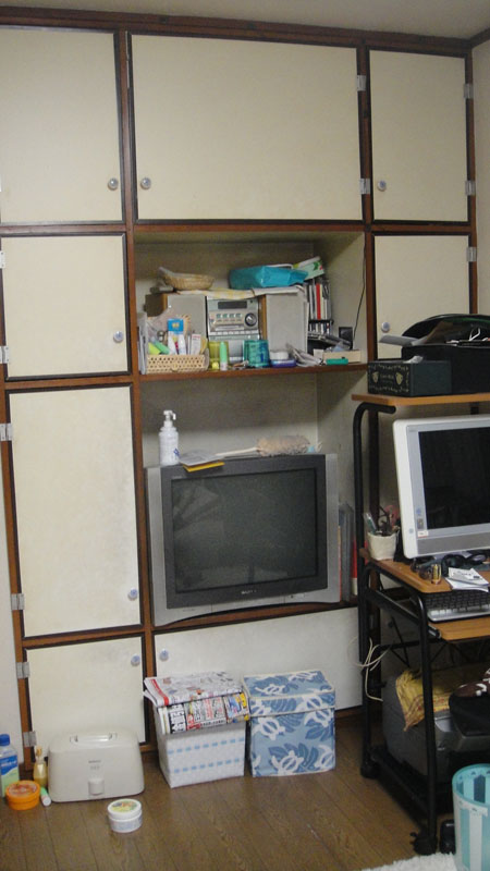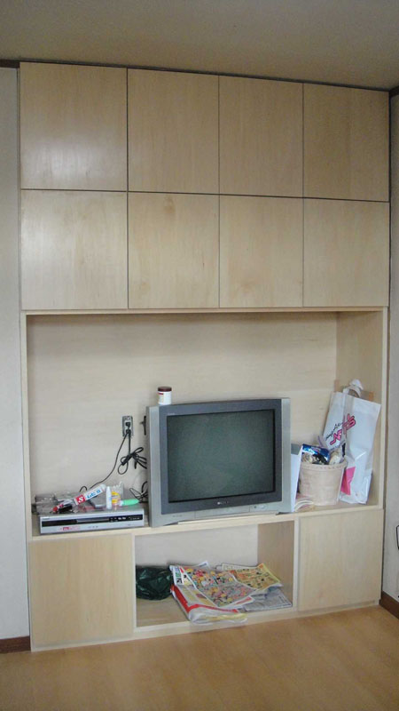 間口1間(1800) 高さ8尺(2400)のスペースに地デジ用テレビ、棚、多目的収納スぺースをシナベニアにて製作いたしました。ワンプッシュで空く、取っ手が無いシンプルなデザインです。天井までたっぷり収納できます。