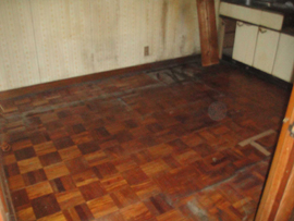 リフォーム前の床です。年数が経っていることもあり、とても傷んでいます。 | キッチンを撤去したところです。 |